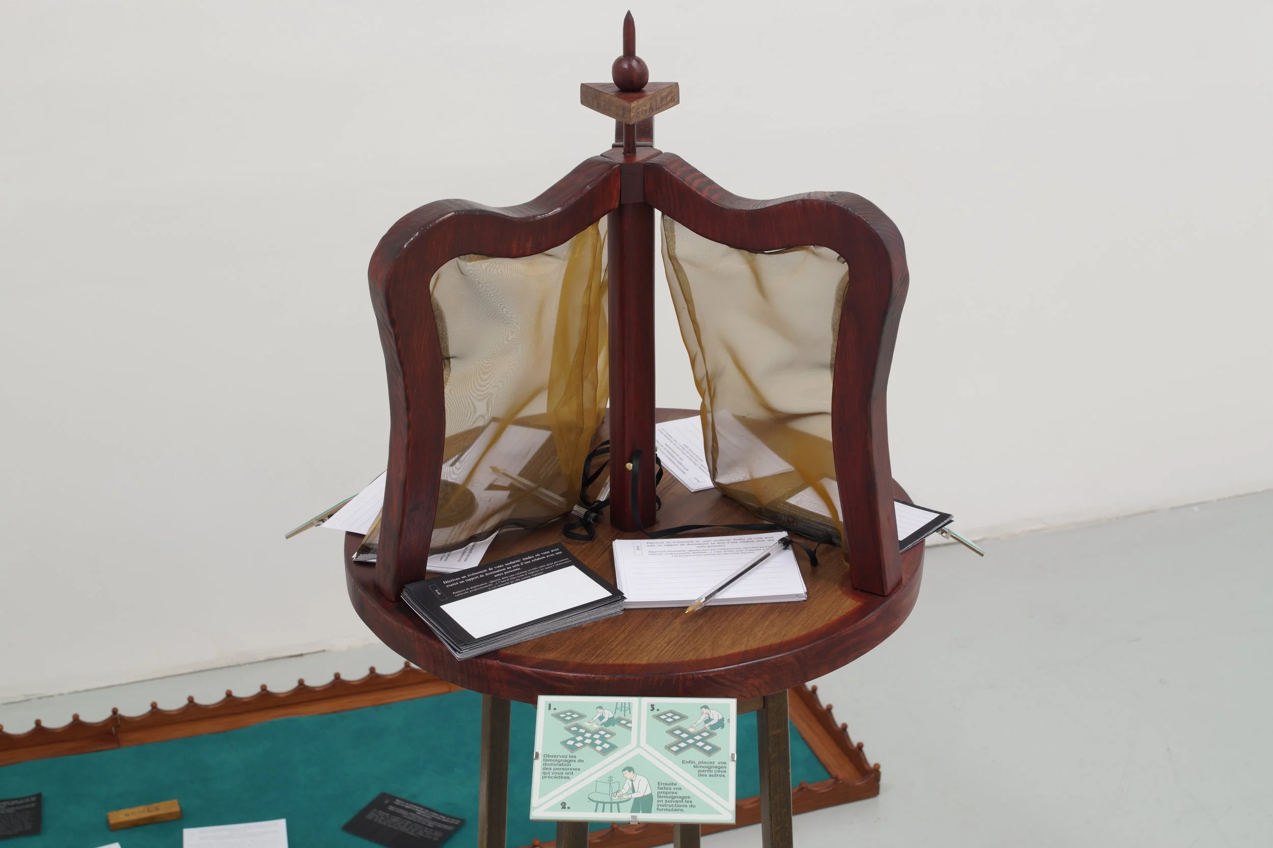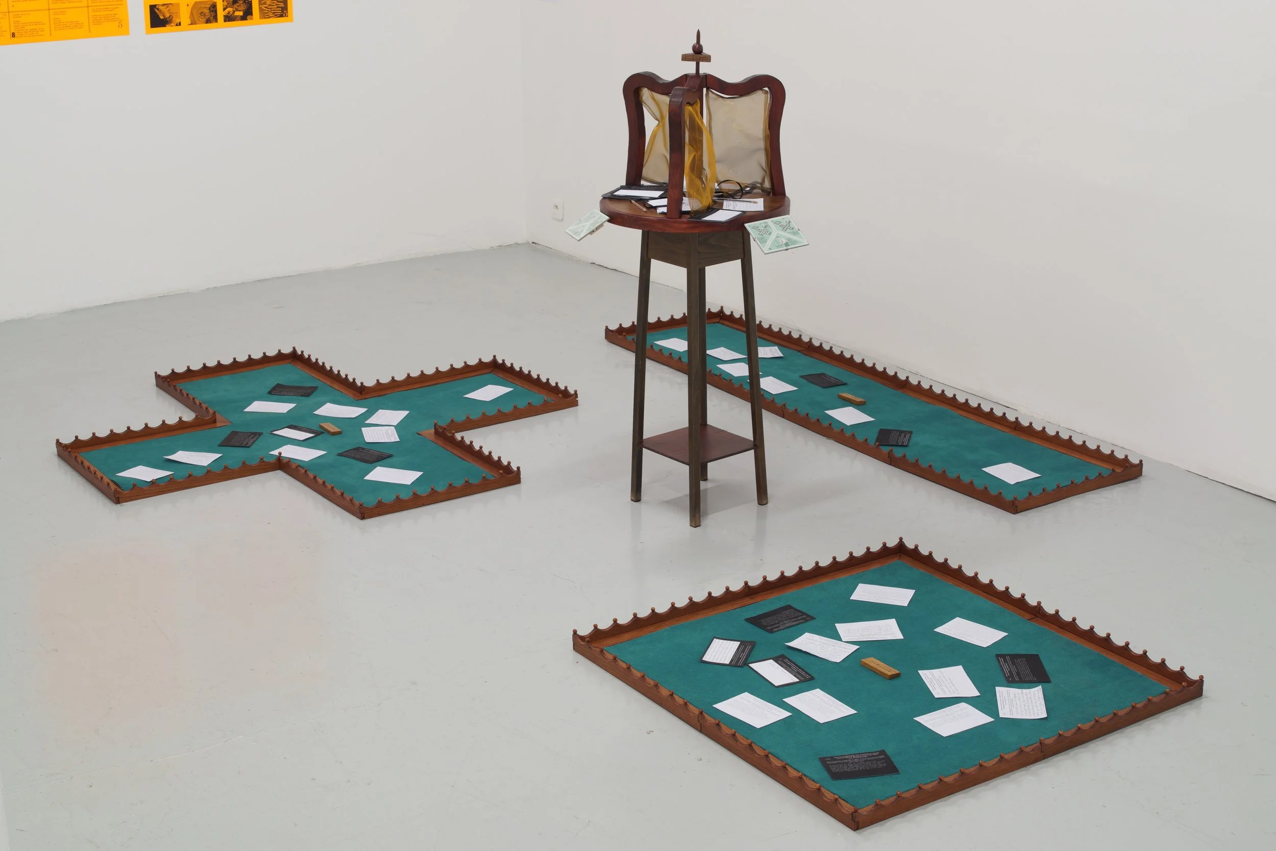Les Beaux-arts de pas pris, Exposition relationnelle, ensemble d’œuvres et règle du jeux, 10x11m, 2023